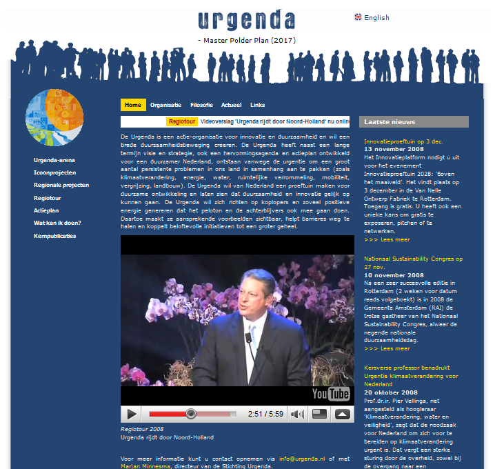 L'Urgenda est une contraction des mots urgence et agenda. Cette fondation lutte pour le développement durable de la societé en Hollande. Le site est riche en élements dynamiques comme des vidéos et des animations.